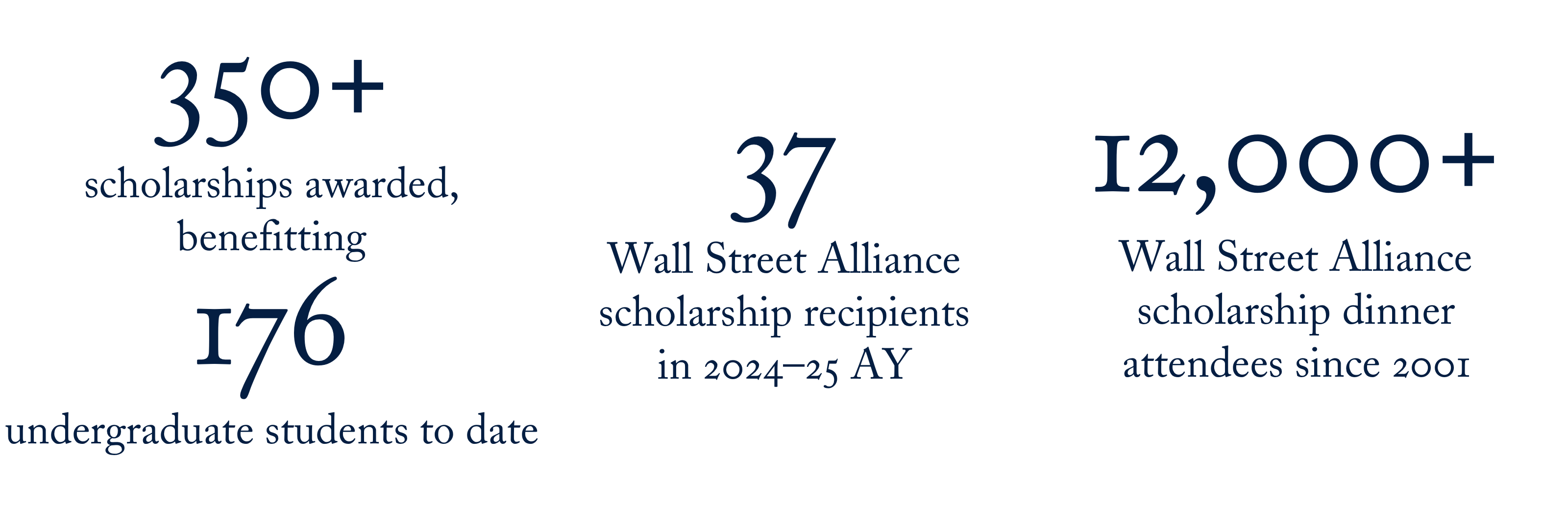 350+ scholarships awarded, benefitting 176 undergrad students to date, 37 wall street alliance scholarship recipients in 2024-2025, 12,000+ wsa scholarship dinner attendees since 2001